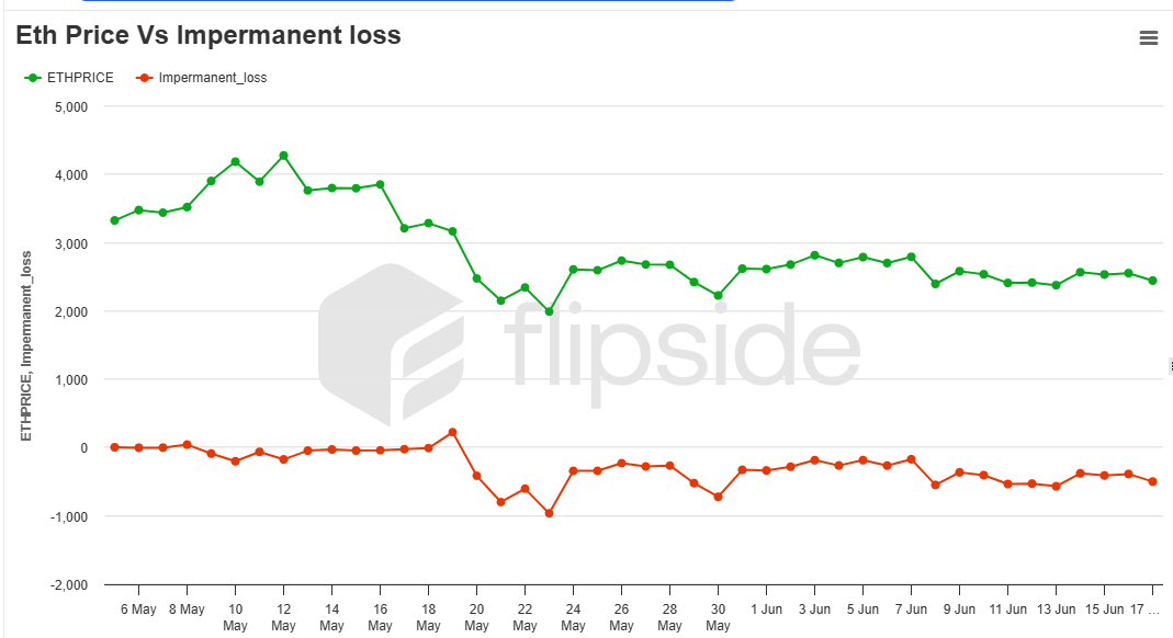 Data reveals that larger daily price changes consistently lead to higher IL, whether ETH rises or falls. A -1.84% price move (see table , row 12, $3801.15 ⇒ $3730 ) within the range yields modest IL ( AssetValueInPool ~ $6701, TotalHoldingValue $6776, IL = -$24.47), but a 18.844% price swing (see table , row 20, $2039.98 ⇒ $2424.39) pushes IL to -$493.277 (AssetValueInPool ~ $4926.6, TotalHoldingValue $5419.9) even in-range