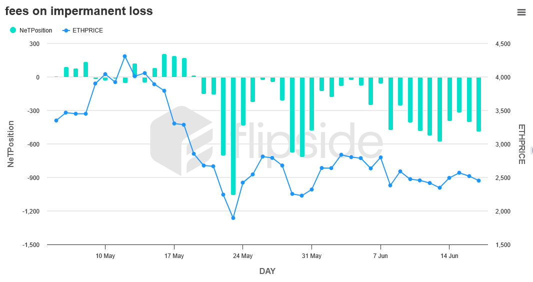 Sharp declines in ETH price coincided with larger negative swings in the LP’s net position, reflecting higher IL.